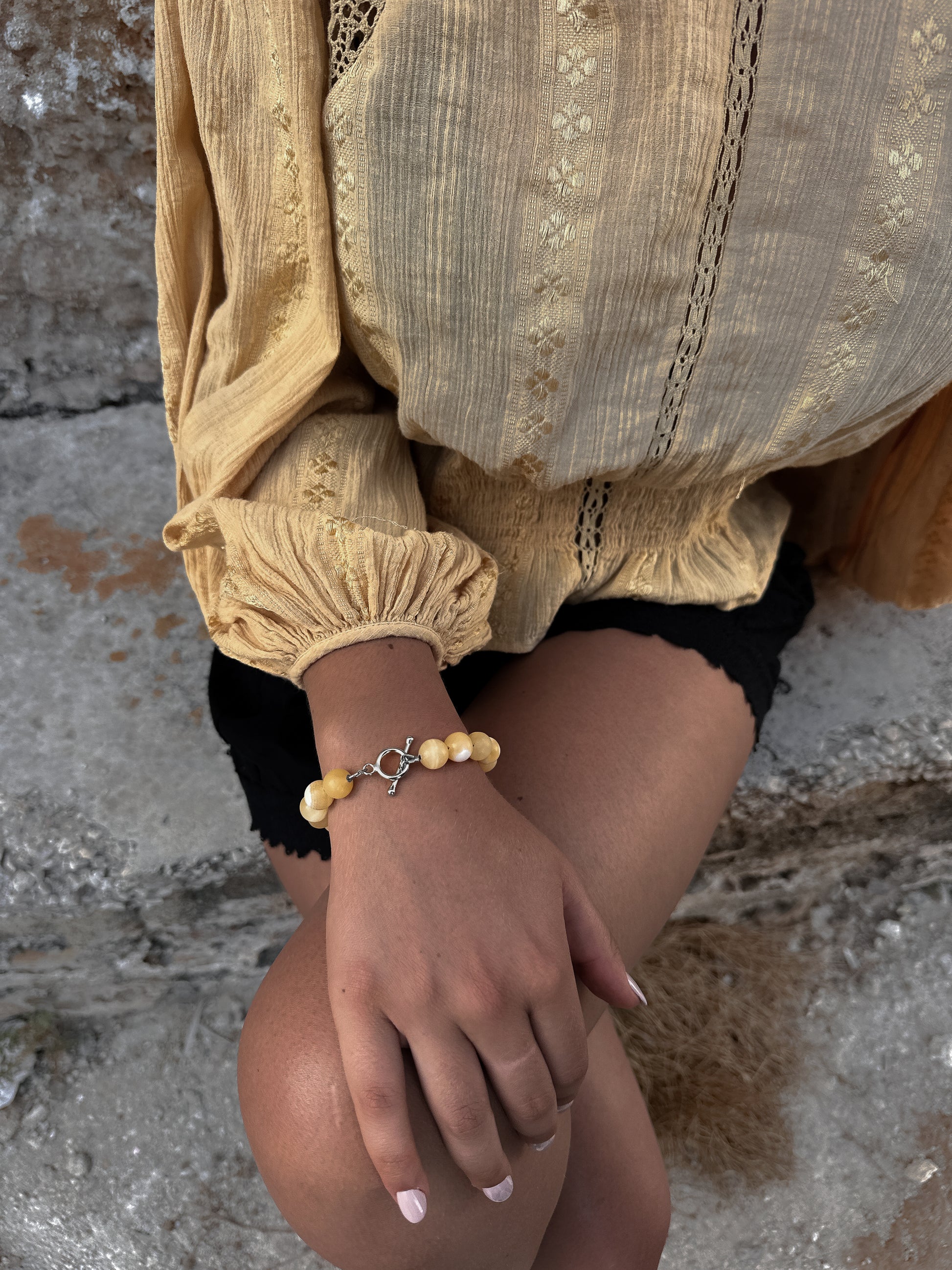 The Solaris Bracelet is crafted from Yellow Calcite stones strung on a silver coloured string, secured with a sculptural sterling silver lock.