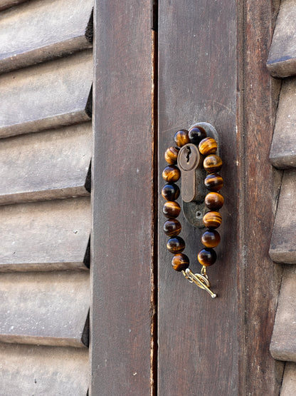 The Amber Bracelet is crafted from Tiger Eye stones strung on a silver string, secured with a sculptural sterling silver lock.