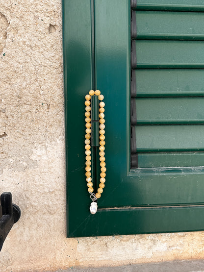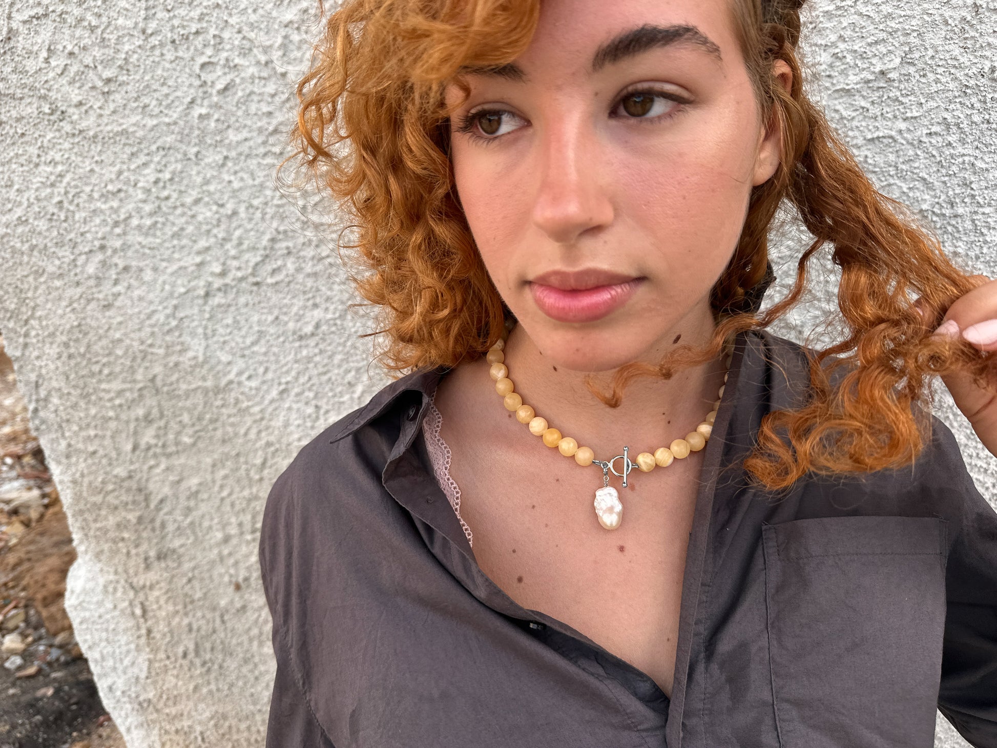 The Solaris Necklace is crafted from Yellow Calcite stones strung on a silver coloured string, secured with a sculptural sterling silver lock.