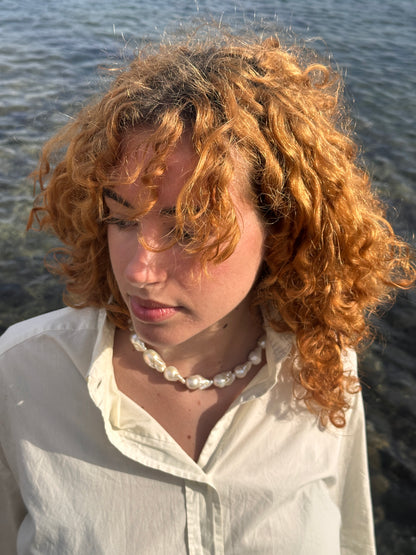 The UNJA Necklace is our unique signature piece crafted from Natural Freshwater Pearls strung on a silver coloured string and secured with a sculptural sterling silver lock.