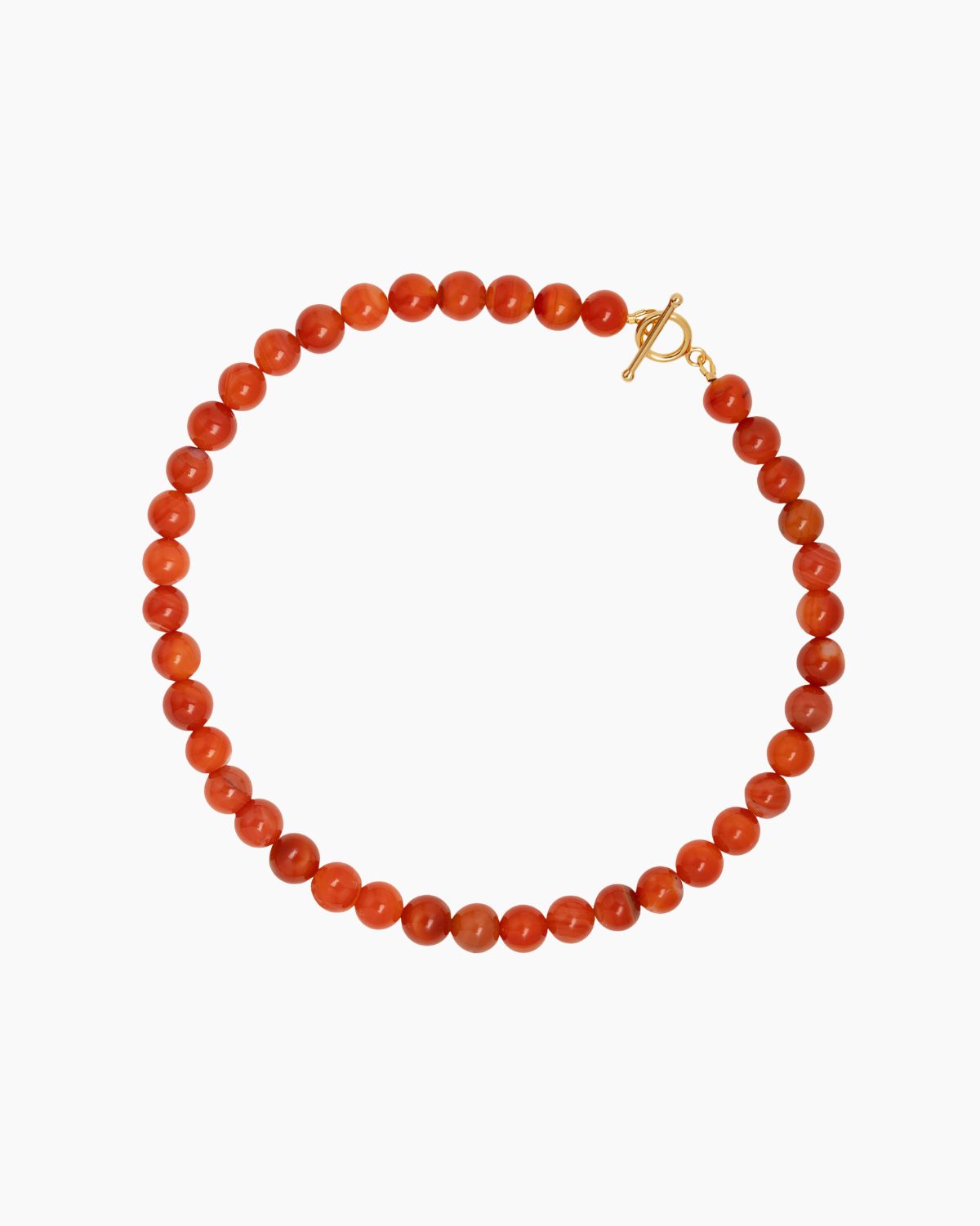 The Ember Necklace is crafted from Red agate stones strung on a gold coloured string, secured with a sculptural 18 carat gold-plated sterling silver lock.