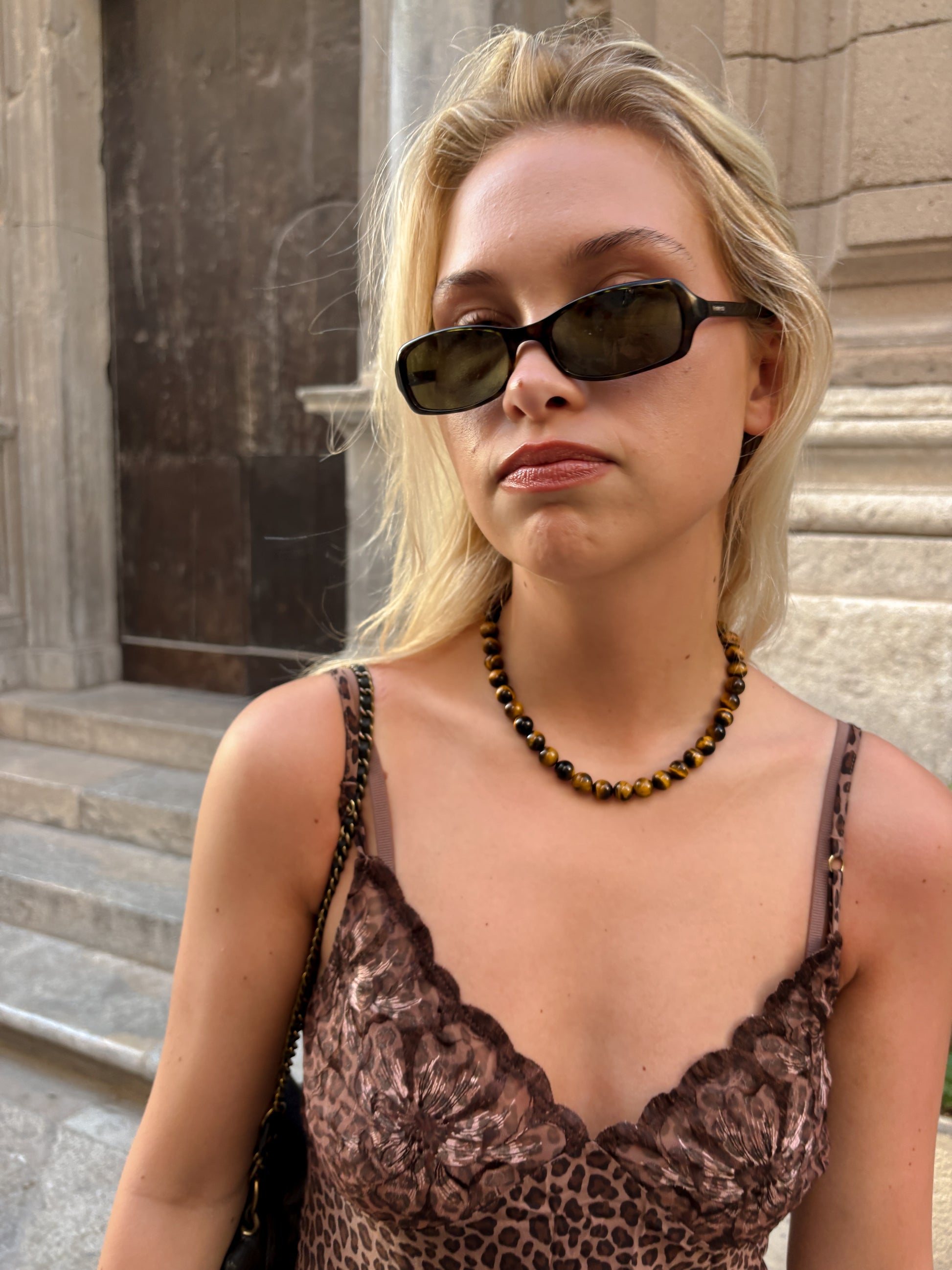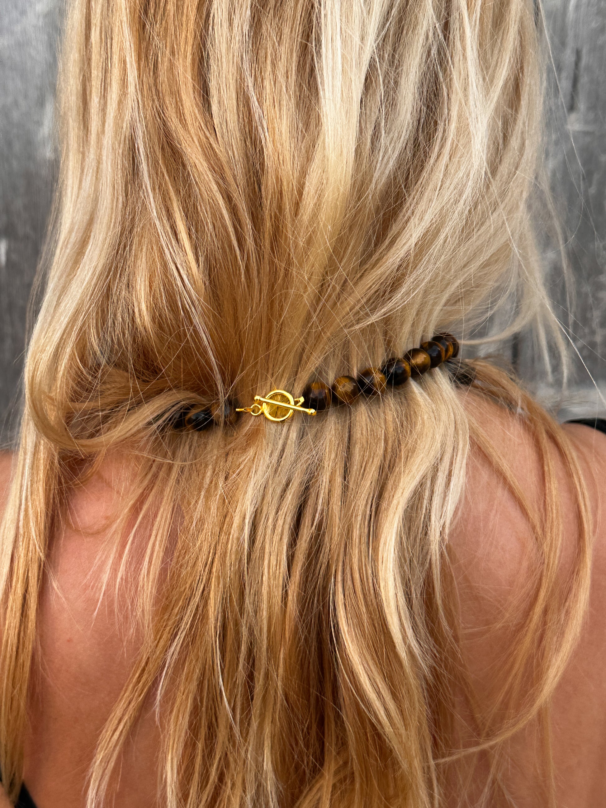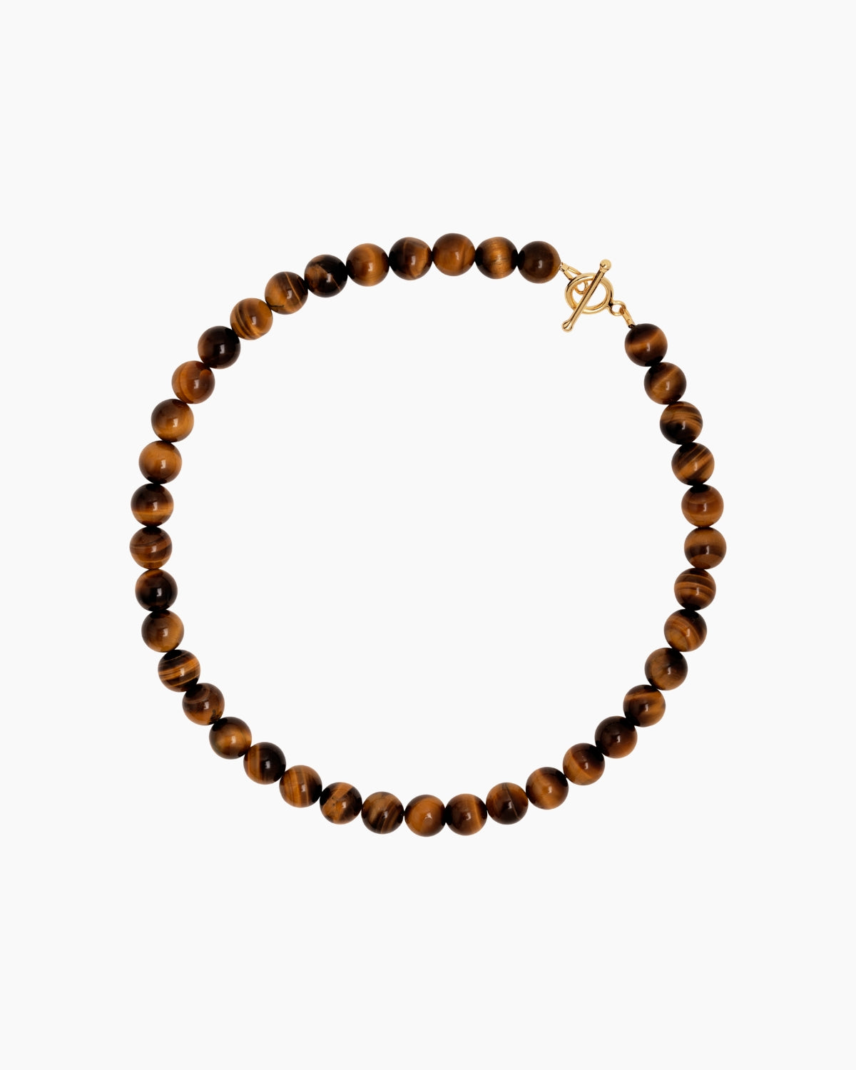 The Amber Necklace is crafted from Tiger Eye stones strung on a silver coloured string, secured with a sculptural sterling silver lock.