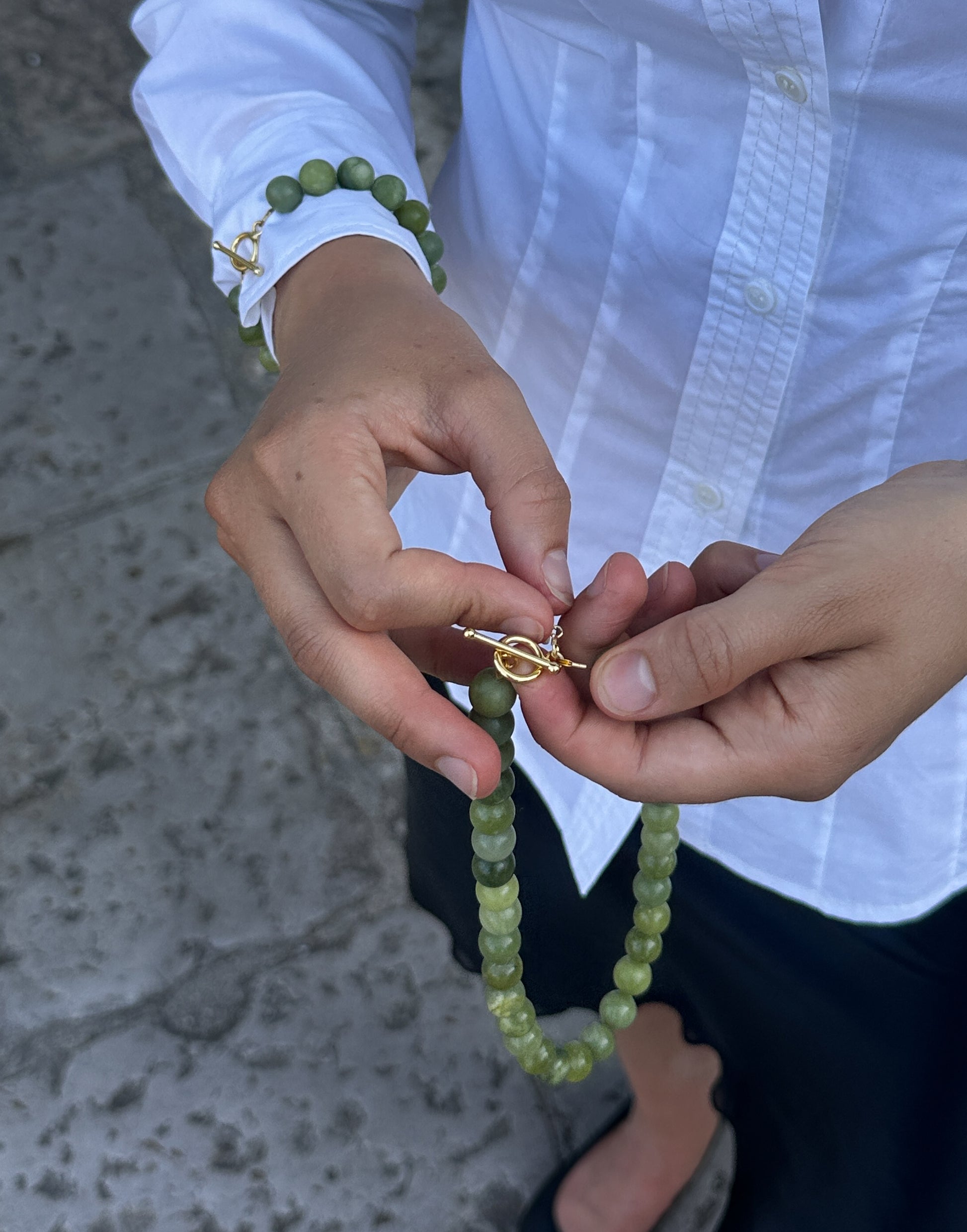 The Jade Necklace easily pairs with other coveted gold jewelry staples. We recommend styling it with the matching Jade Bracelet for a complete look.