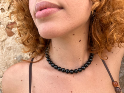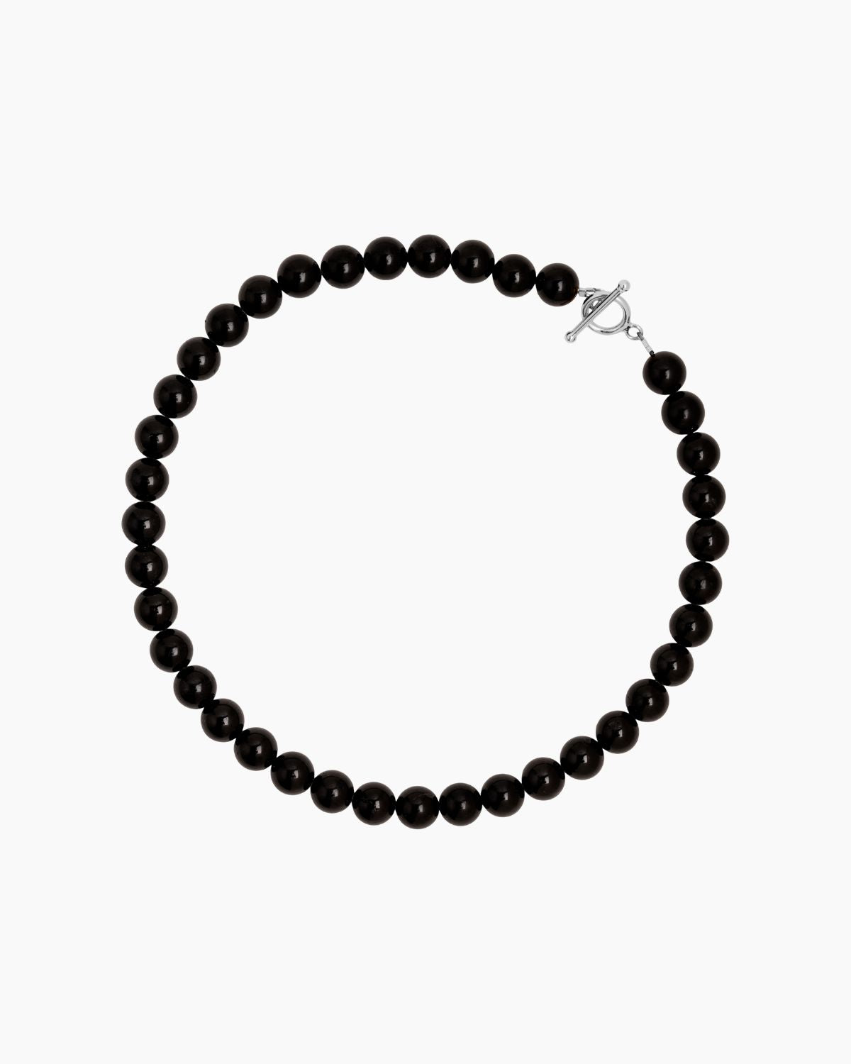 The Onyx Necklace is crafted from Black Obsidian stones strung on a silver coloured string, secured with a sculptural sterling silver lock.